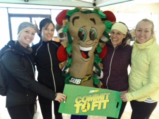 With some of my Toronto running family we hit up the pre-race Friendship run and did the shake out 3km on Saturday morning. There were about 20 other runners there with the staff from the Running Room. We had a wonderful run through a random April blizzard and enjoy post run treats provided by sponsor Subway. We grabbed our race kits and took part in many of the expo festivities which also included a “spin-the-wheel” Commit To Fit adventure where I challenged a giant sandwich to a push up contest – I won a $5 Subway gift card, yum!
