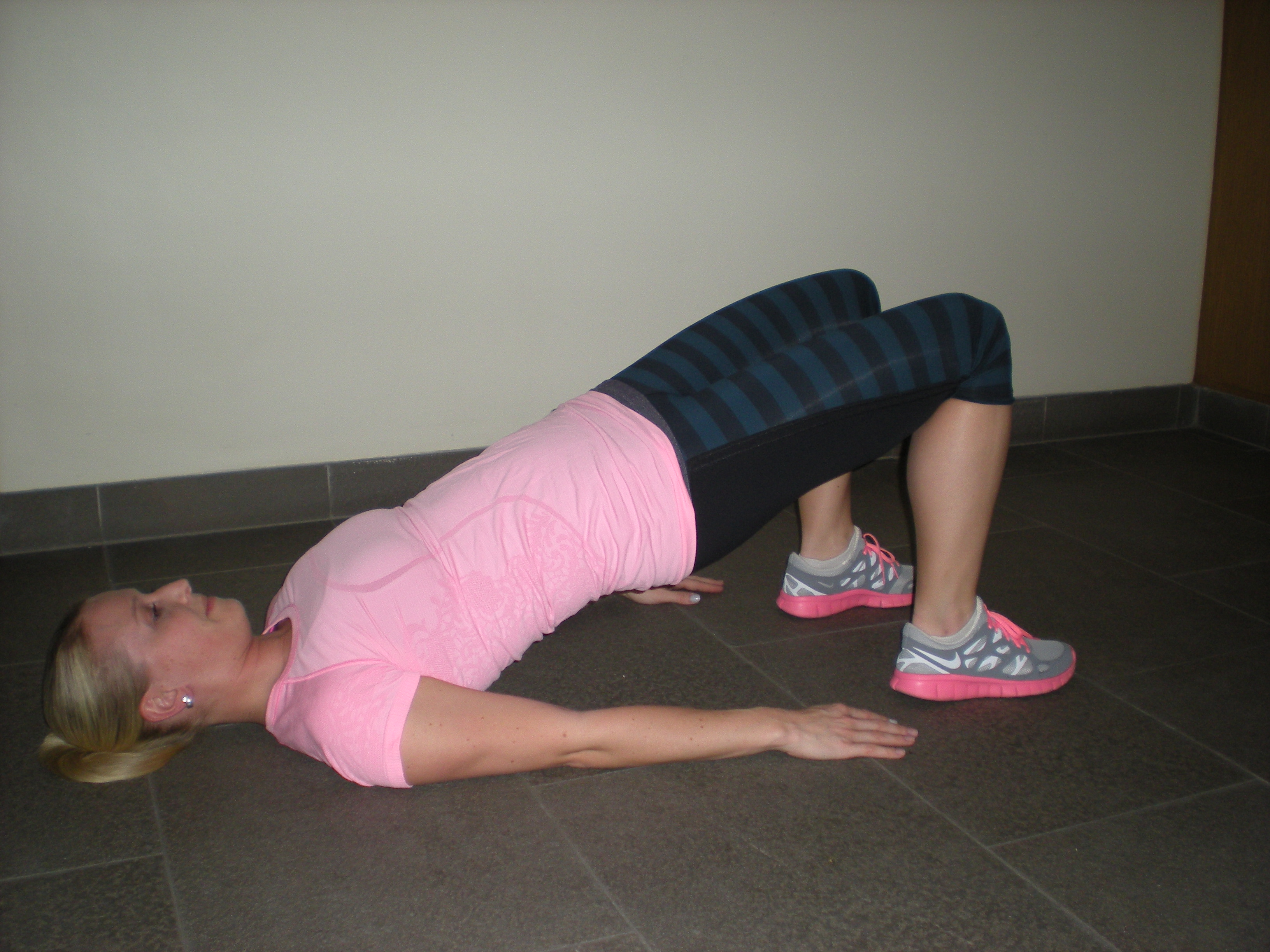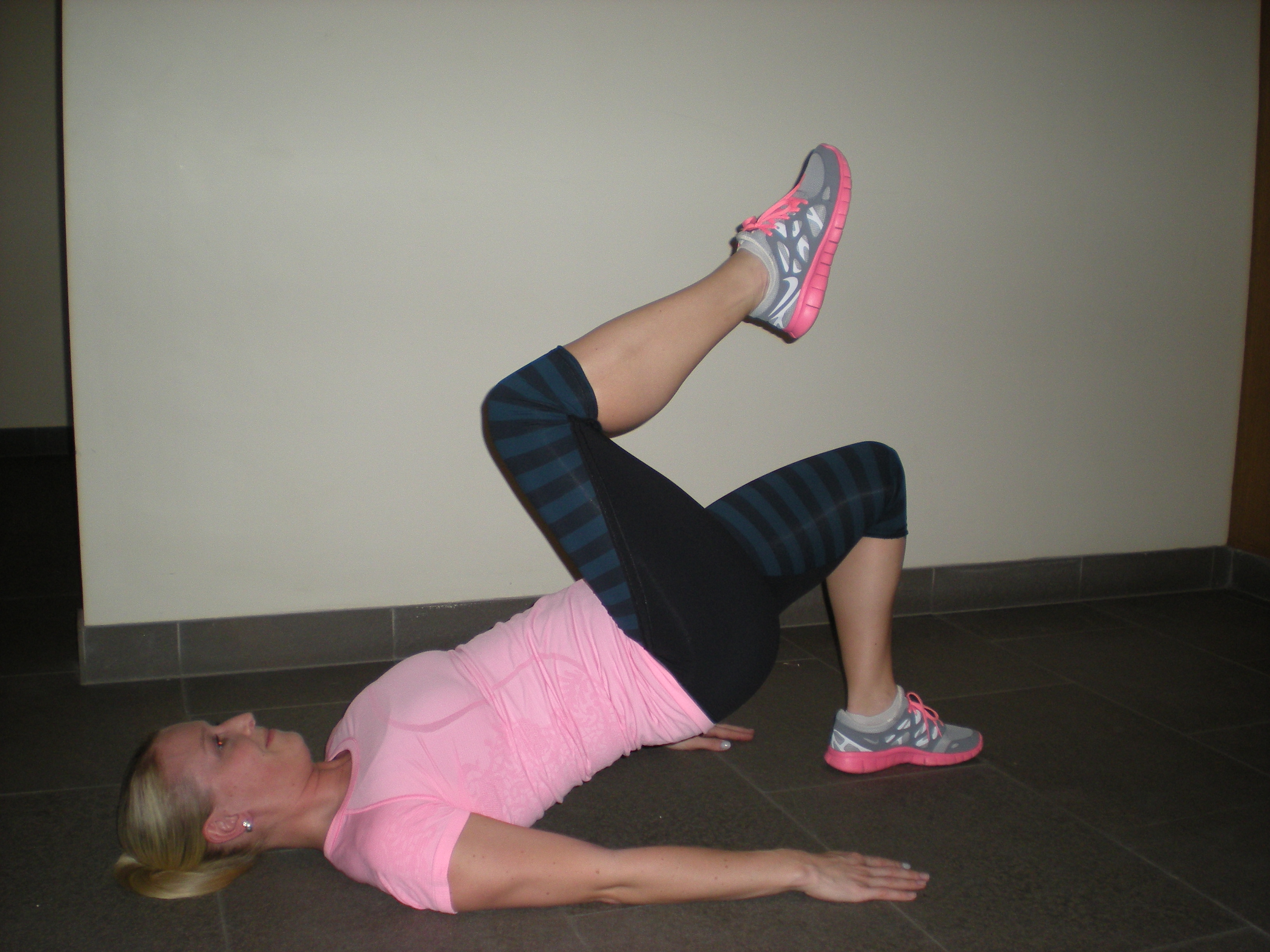 Lying on the floor with hands along the side of the body. Bend knees and bring heels as close to the seat as possible. Press both feet into the floor and engage your gluts as you raise your hips into the starting bridge position. For one minute engage your core raising one leg at a time up towards your chest.