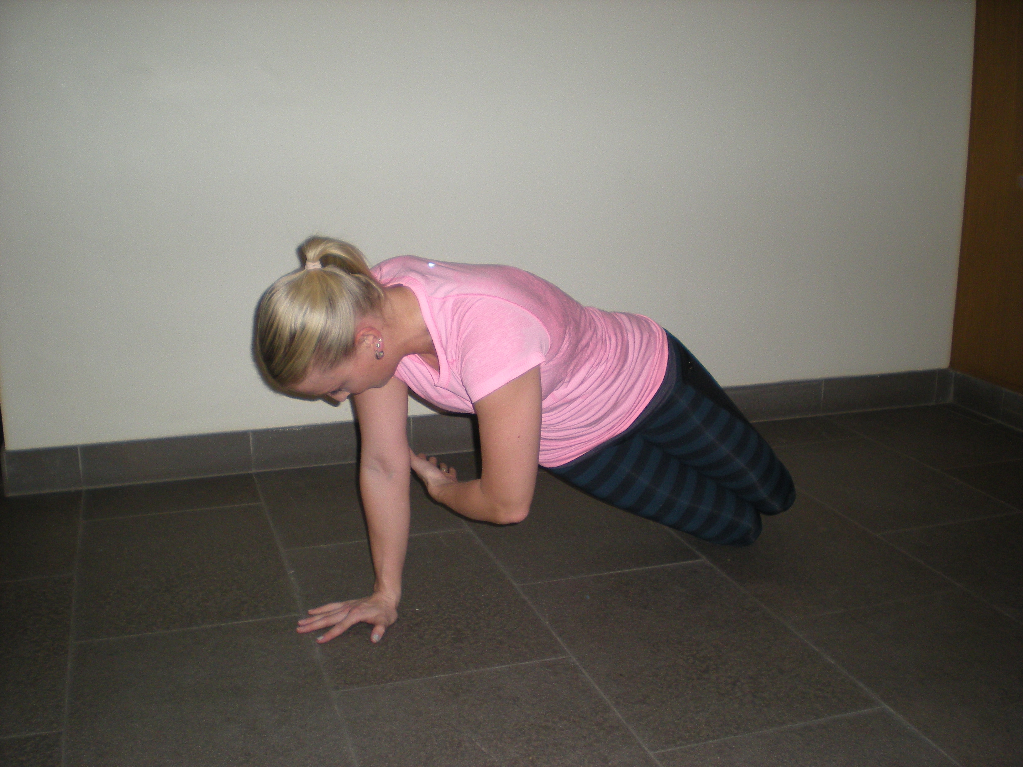 Place your hands shoulder-width apart on the floor and extend your legs behind you. Press into your hands lifting your core and upper body into the top position of the push-up, knees remain on the flow (modification: extend legs and left knees into full plank). Your body should form a straight line from head to knees (or heels). Lower the body towards your left wrist until your chest nearly touches the floor. Slide your body from left to right hand and with weight over your right hand push back to start, fully extending your arms. Repeat circling in the opposite direction. perform for one minute.