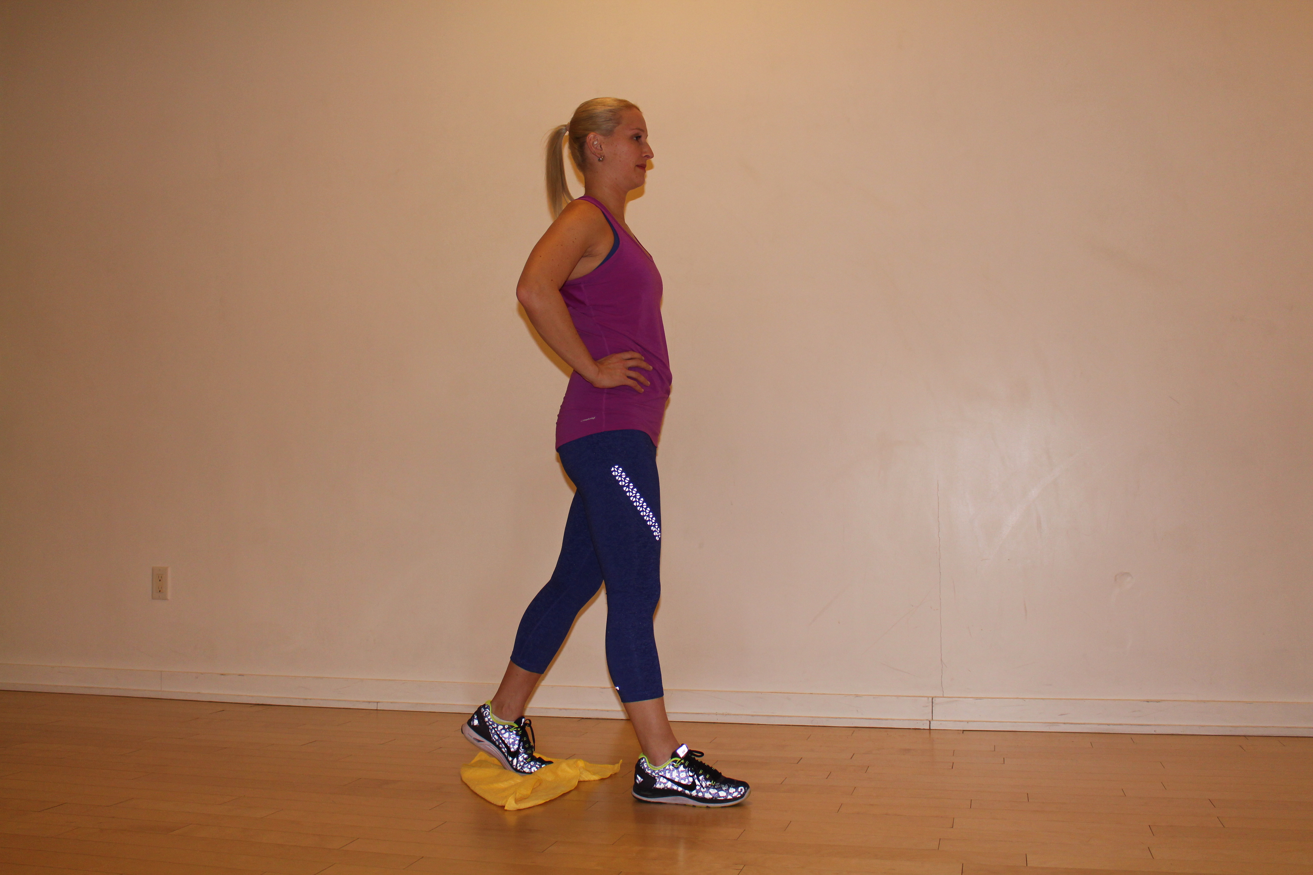 Stand tall with feet hip-width apart, and a tea towel under your right foot. Slide your right foot backwards and slowly lower your body until your front knee is bent at least 90 degrees.