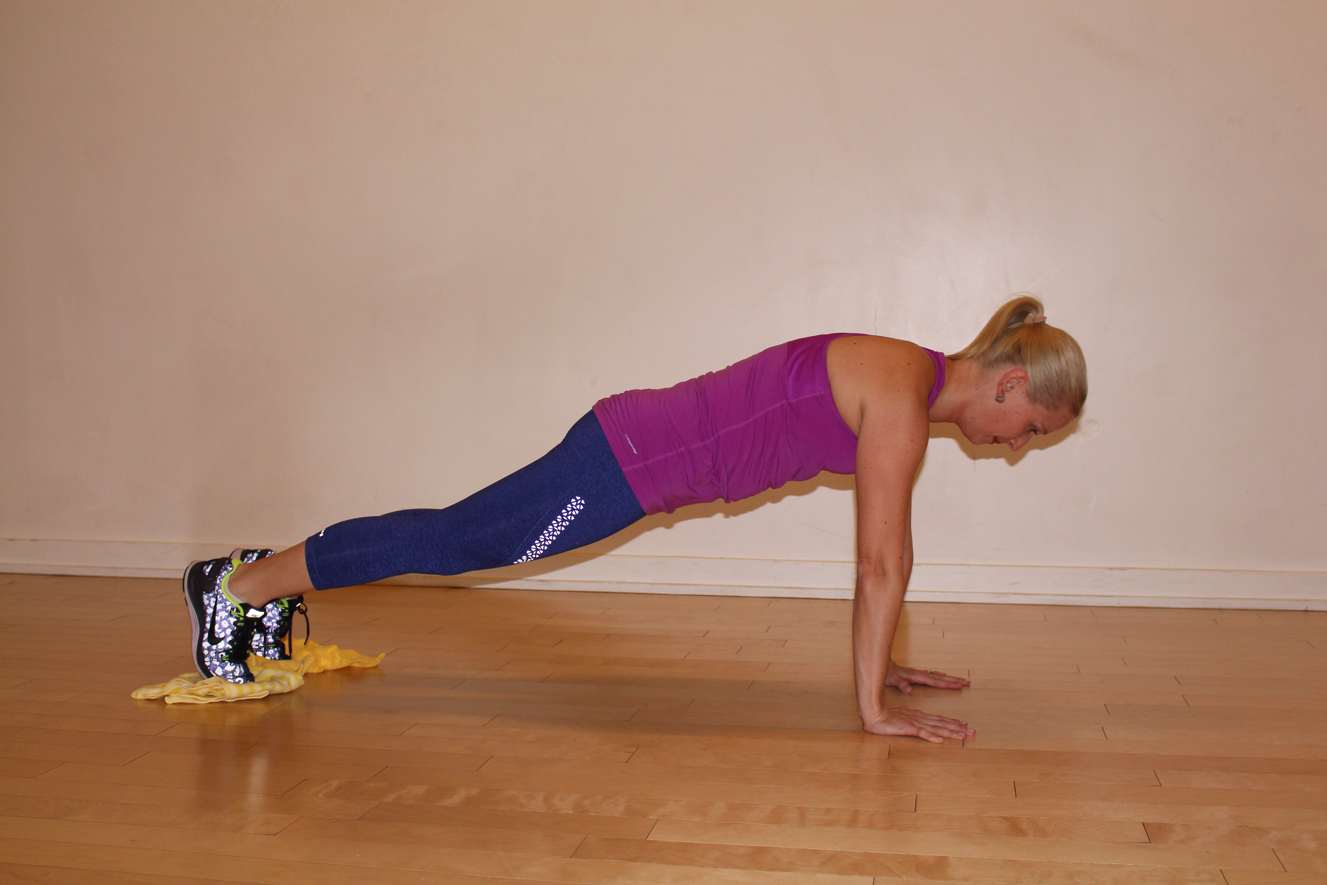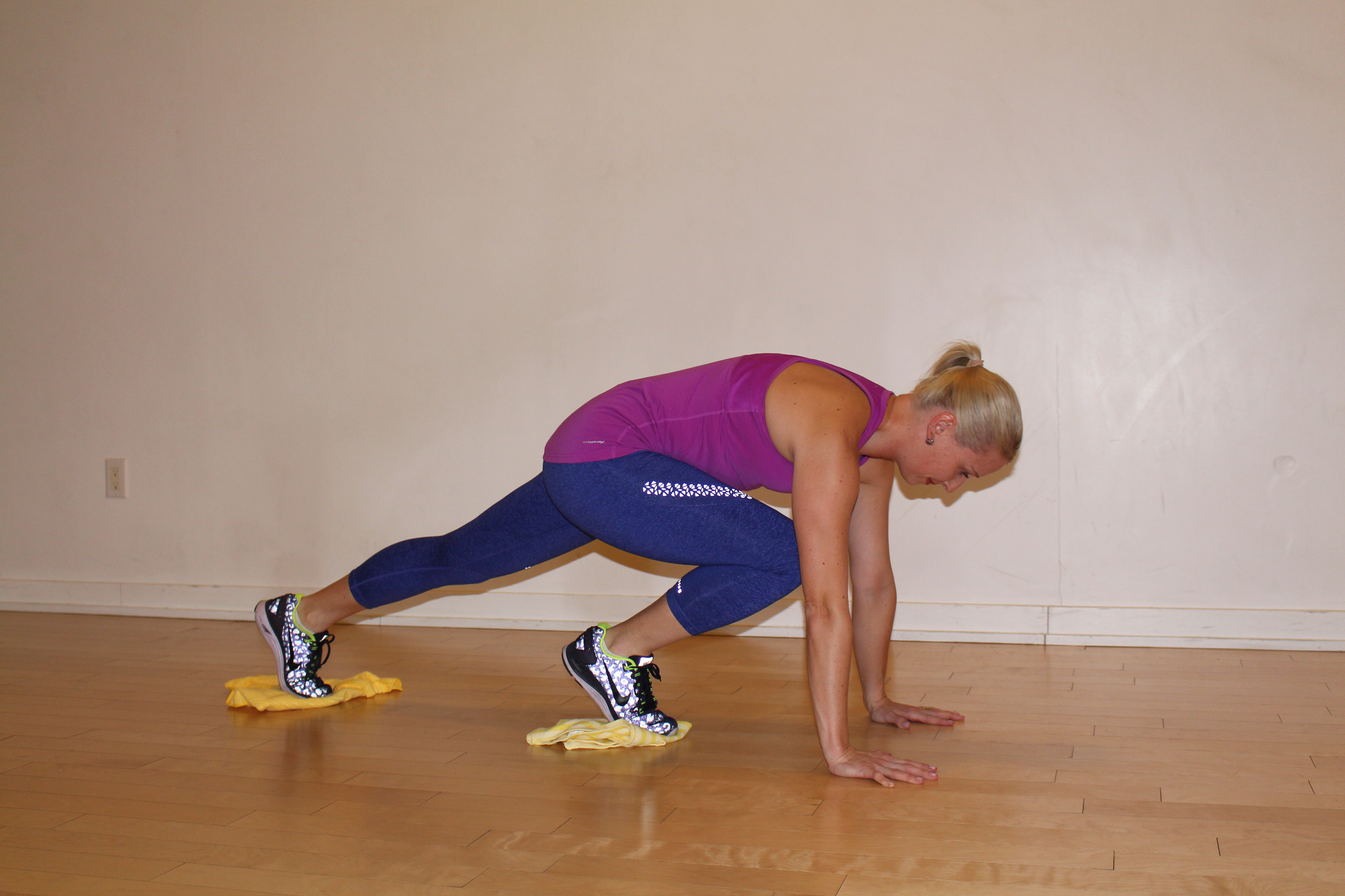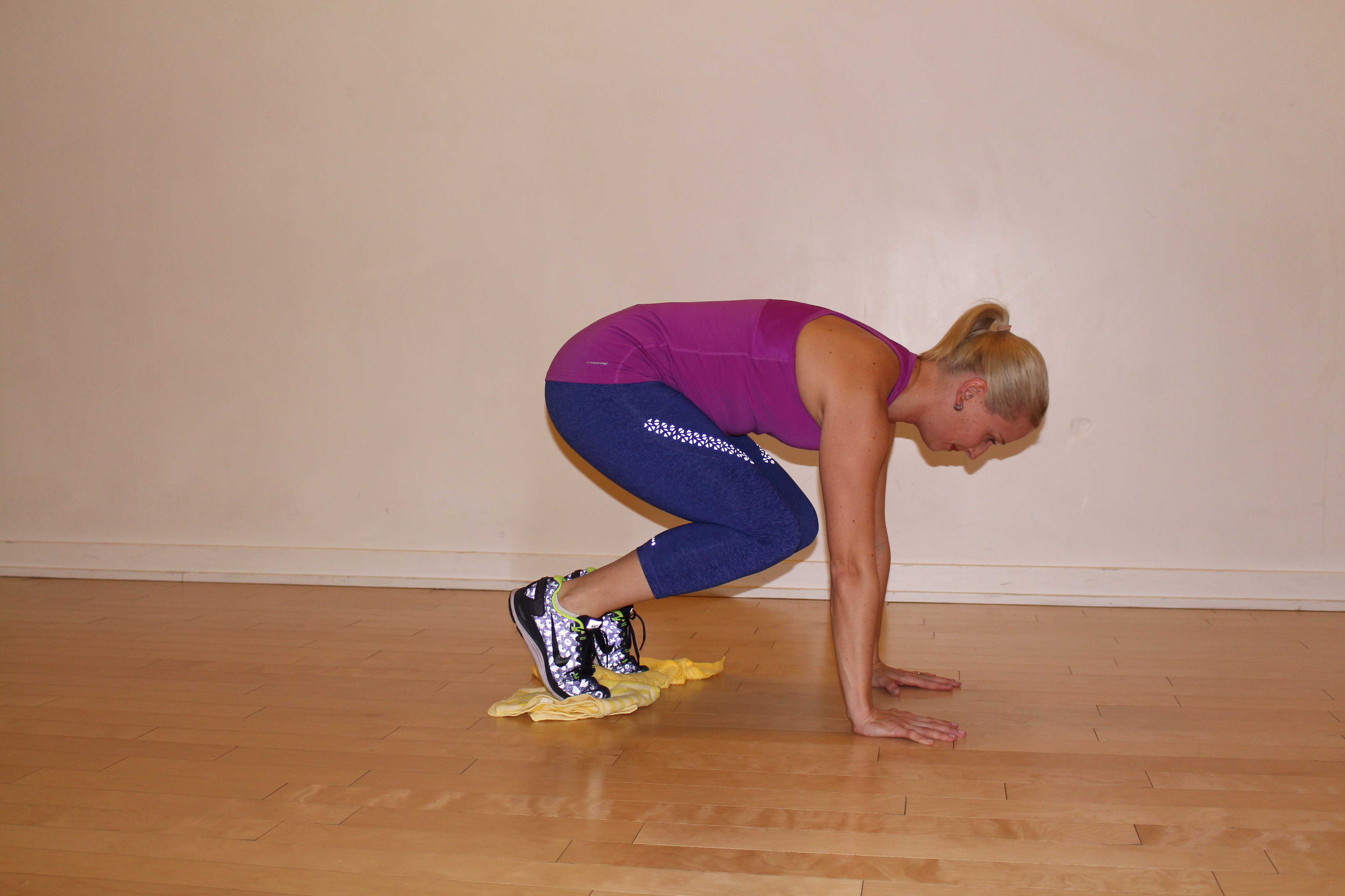 Starting on all fours place your hands on the floor slightly wider than and in line with your shoulders. Both feet are positioned on their own tea towel extended straight behind the body (in high plank). Engage your core and slide both knees in towards your chest keeping your seat in line with your shoulders.