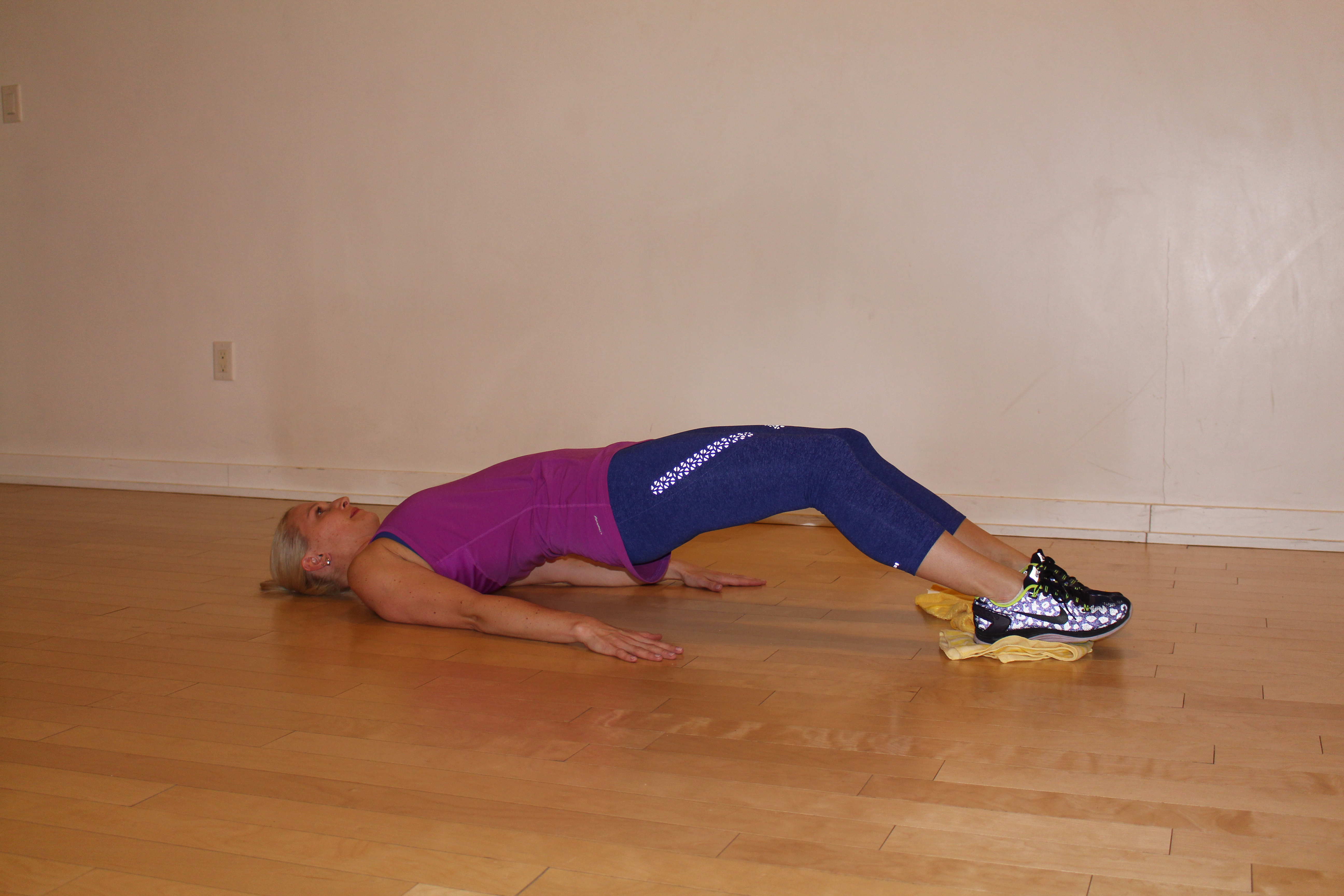 Lie face-up on the floor with your knees bent and each of your feet on their own tea towel. Raise your hips so your body forms a straight line from your shoulders to your knees. Slide both feet away from the body extending as far as possible without dropping your hips.