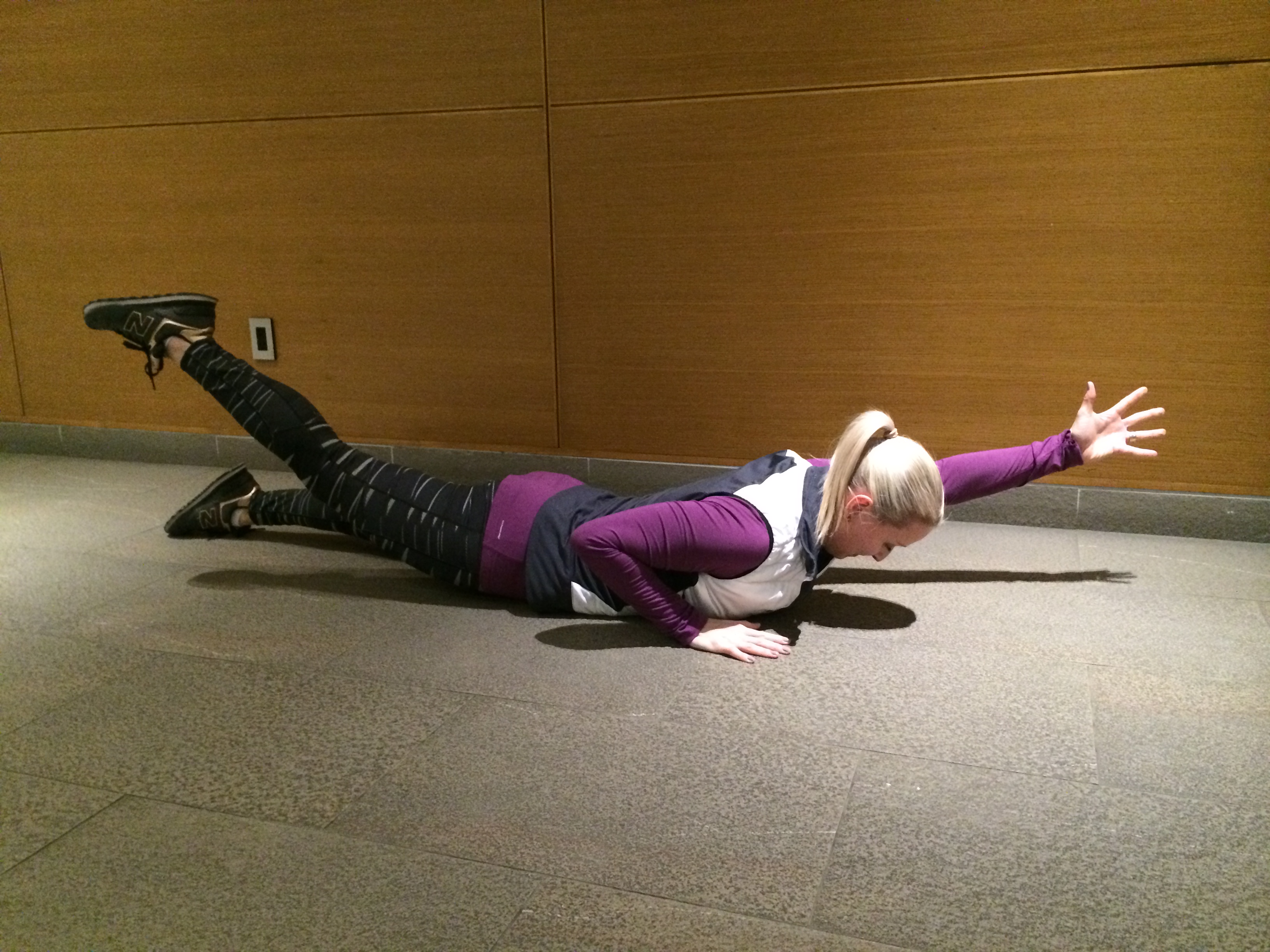 Contract your glutes and the muscles of your lower back, and raise your head, chest, right arm, and left leg off the floor. Hold for 15 seconds, lower and repeat using your left arm and right leg. Hold and repeat again on the alternating sides.