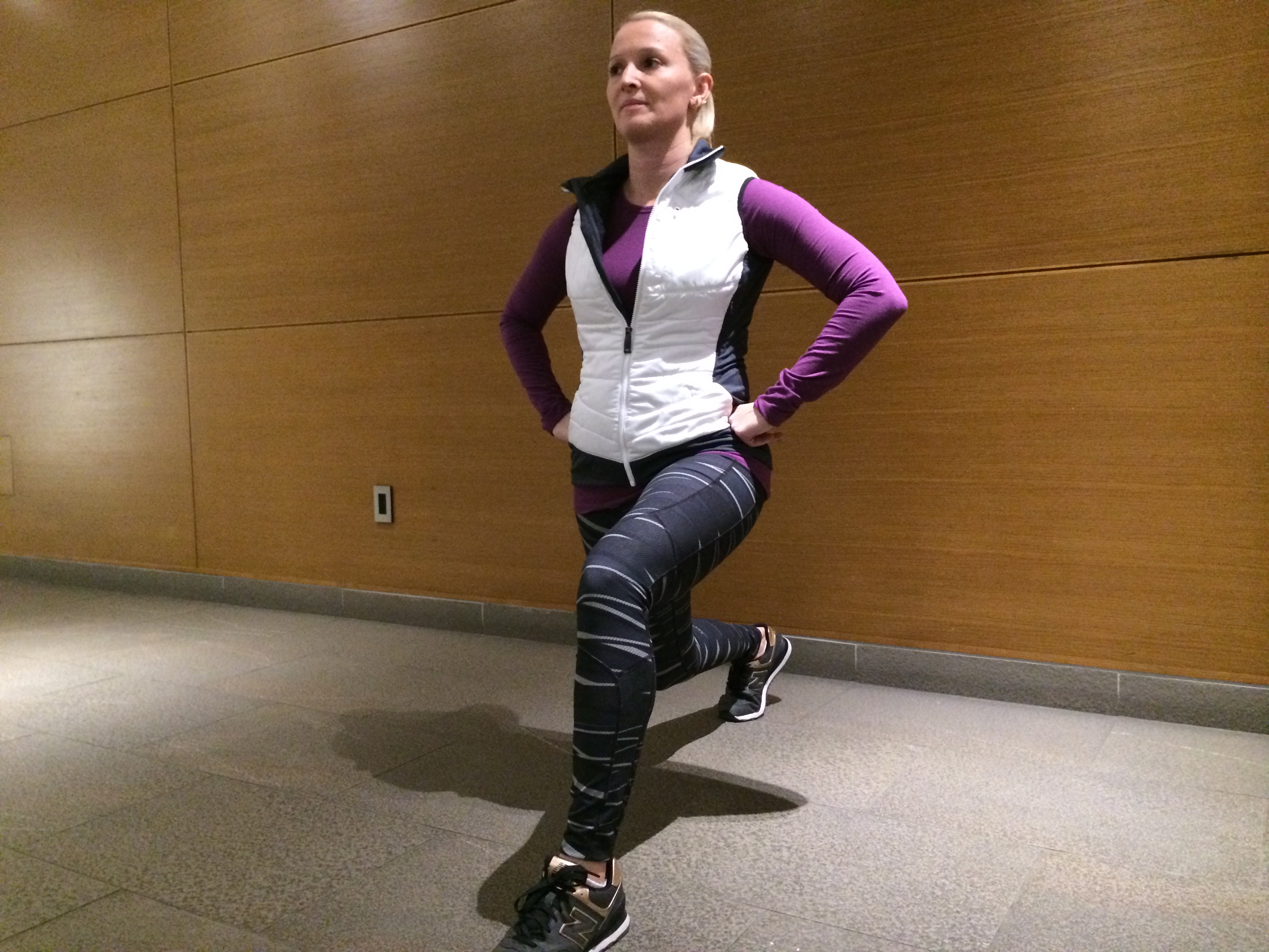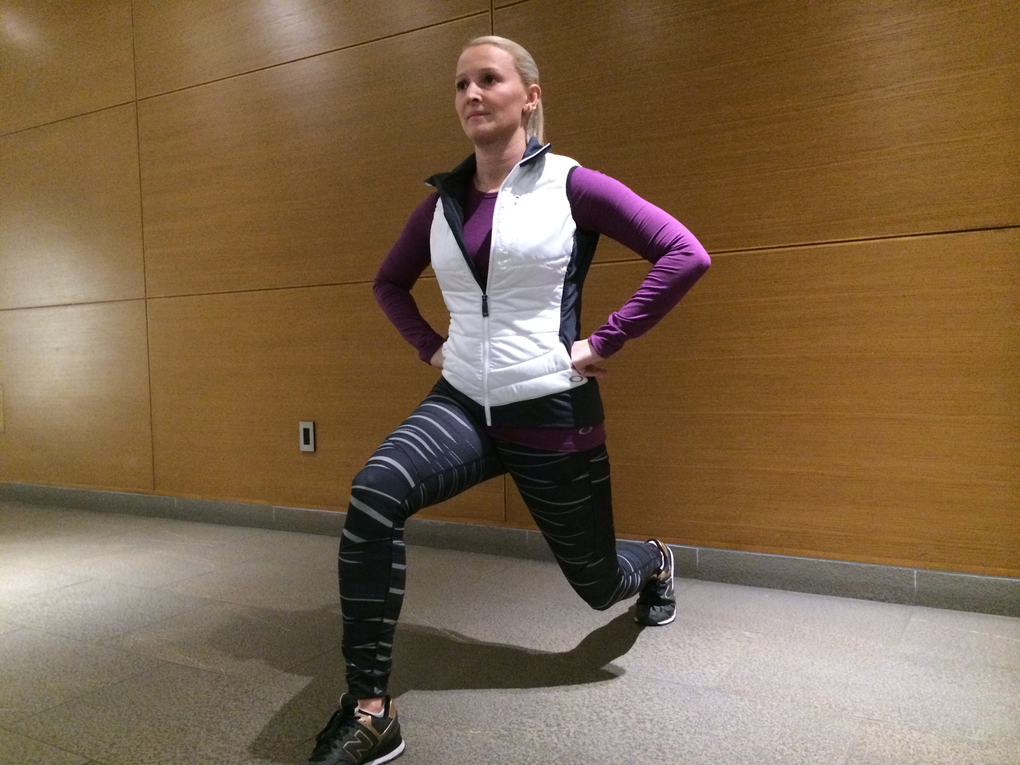 1. Clock Lunge: Standing with feet hip distance apart, step forward in to a standing split position and slowly lower your body until your front knee is bent to at least 90 degrees. Pause and then return to standing.