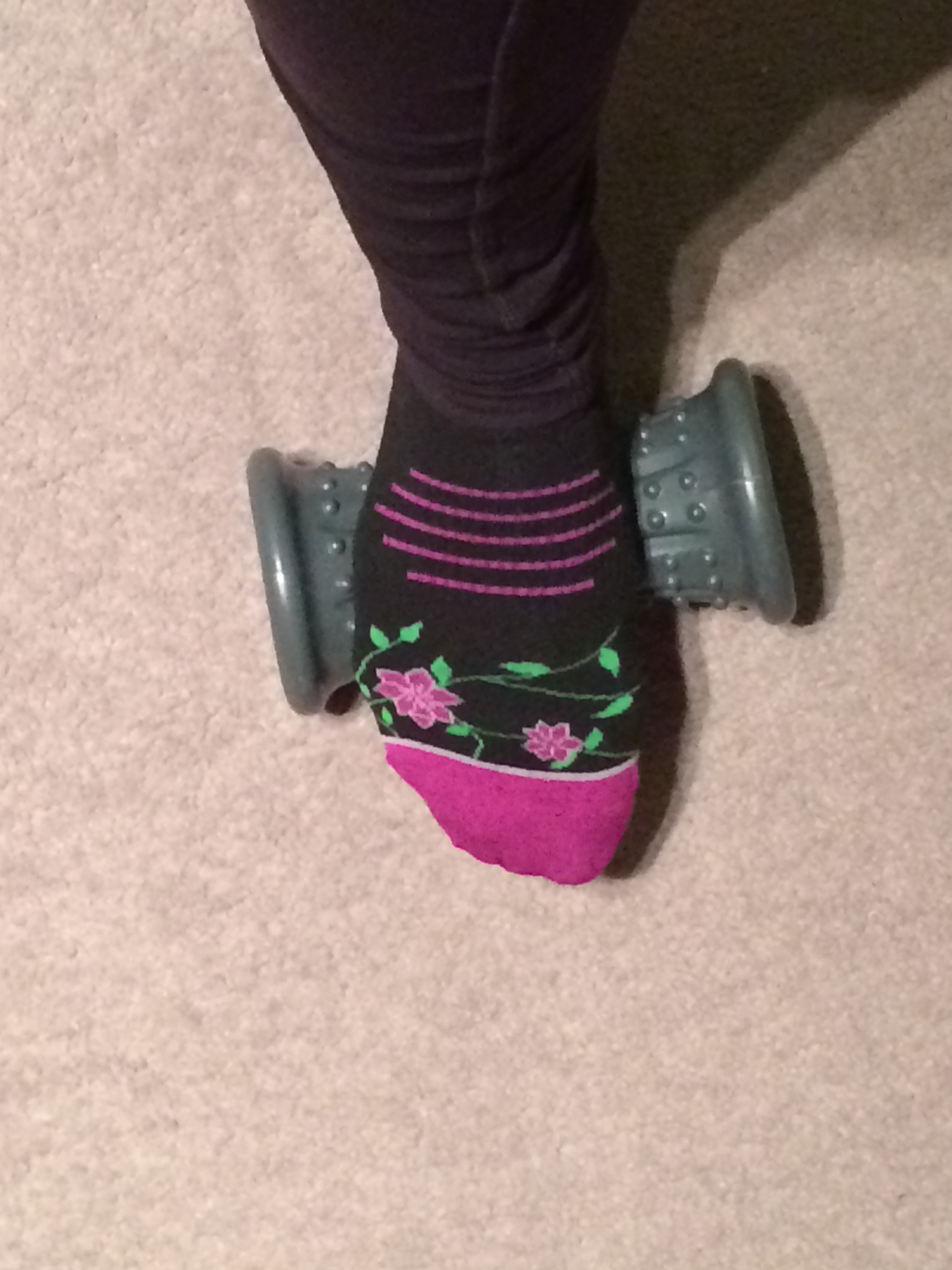 I began taping it for most long runs and definitely every race. I got acupuncture to speed the healing, and while at home stretching in the evenings I began doing lots of rolling as well. I rolled with everything from tennis balls (they often broke) to baseballs (way to hard and hurt so good), so when I came across the Gaiam Hot & Cold Foot Roller, with it’s unique shape and bumps, I had to give it a try.