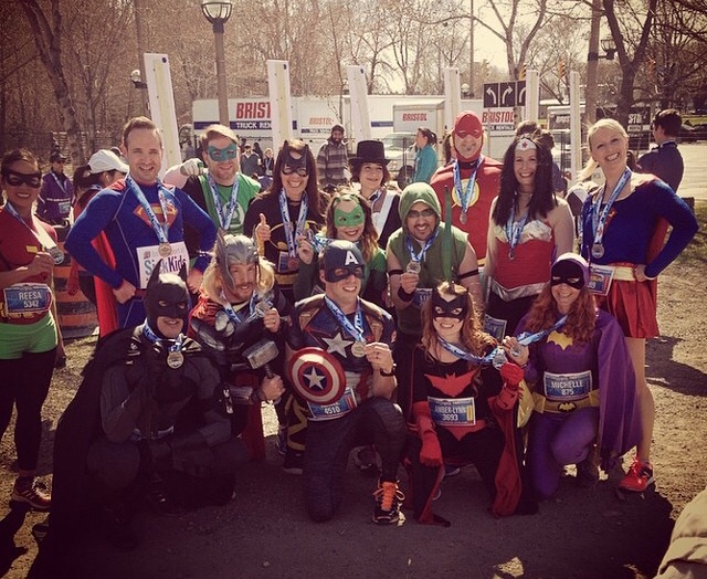 Under the leadership of JP Hernandez, the 15 of us sported our superhero gear and took to the streets of Toronto raising money for Sick Kids Hospital. The morning was incredibly cold. And as you’ll see from my photos, there wasn’t much to my outfit. A frequent comment and questions, was around my pants not showing up for the race. We were fortunate that the sun was out and with a clear sky we kept to the sunny sides of the street during the race.